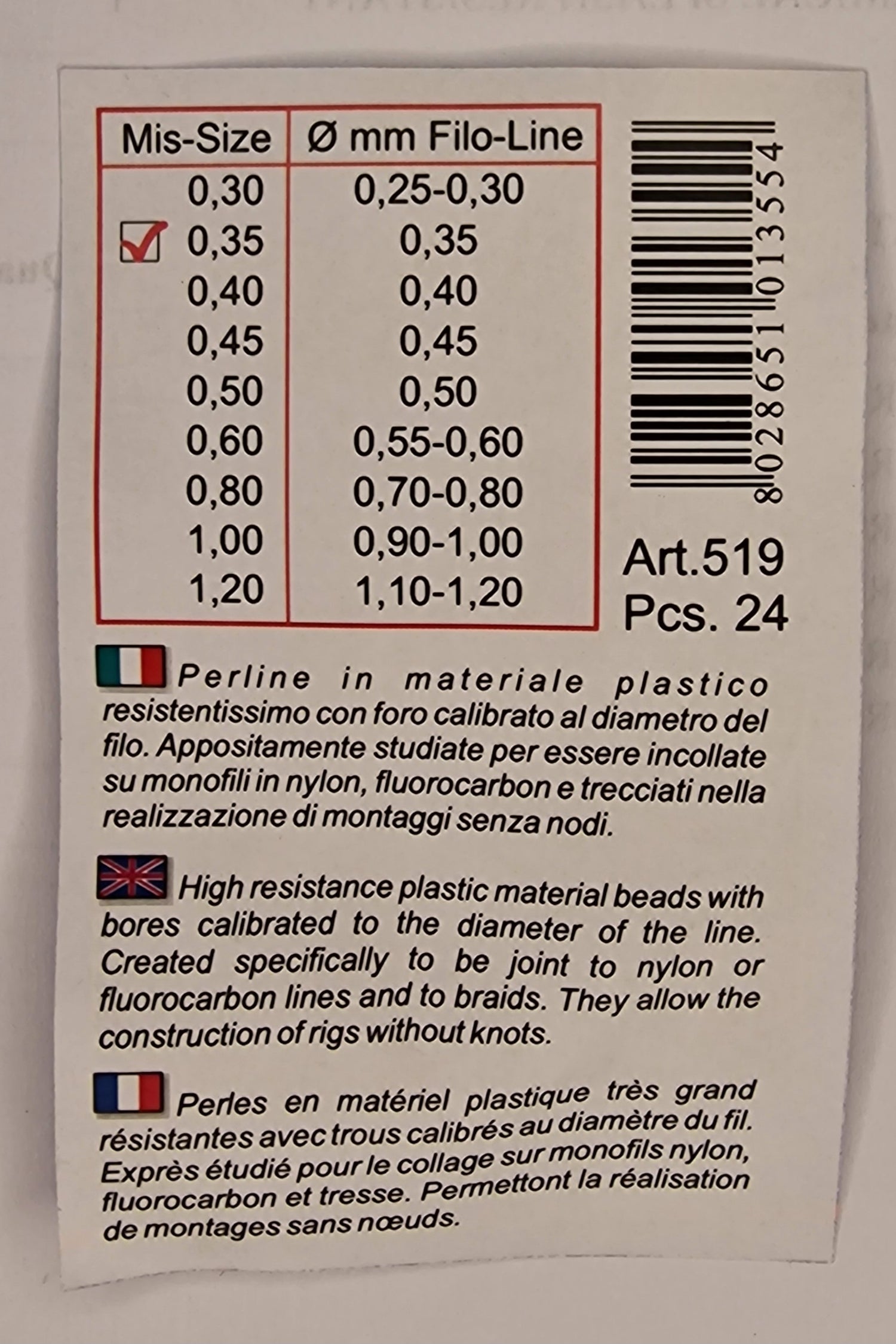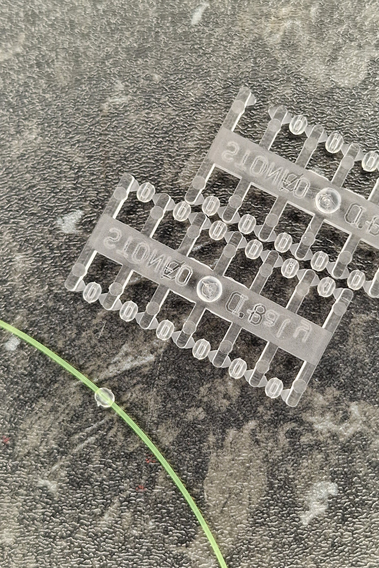High Resistance plastic material with the bores calibrated to the line diameter. Created to be glued in place instead of a knot or crimp creating a very neat connection.