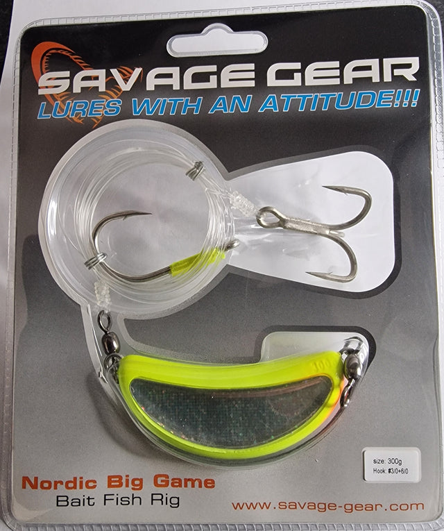 The 300g big game Nordic Bait Fish rig is perfect for halibut and other big saltwater predator fish. A non-tangle, specially shaped sinker colored with glow and UV spray helps to attract curious fish. Double Hook set-up to ensure you don’t miss any bites when using big baitfish. 100 per cent 160cm 1.0mm flourocarbon trace for perfect baitfish presentation.