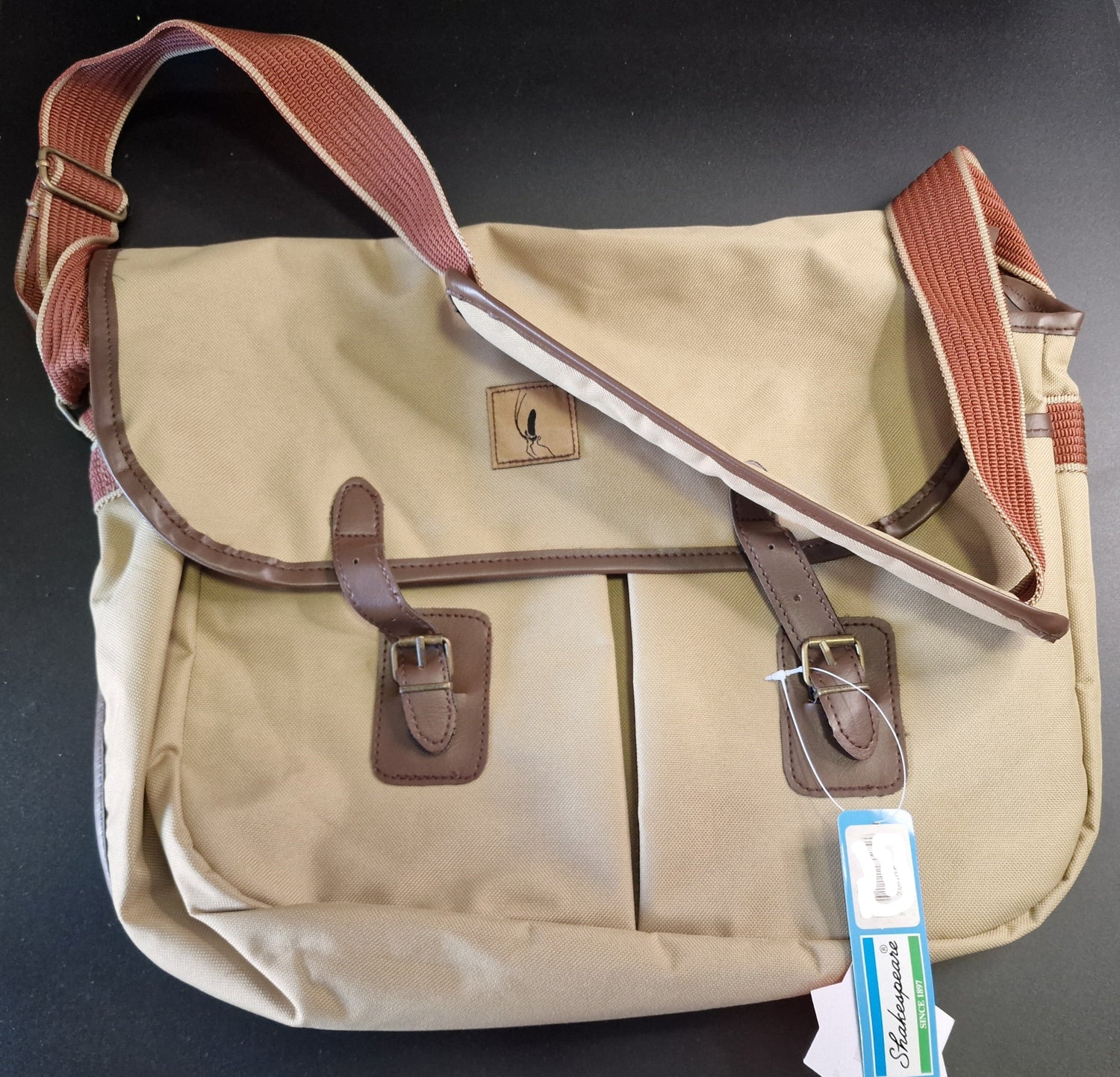 Shakespeare Agility River Bag, Traditional canvas effect material with shoulder strap and buckle fastening 40cm x 30cm x 10cm. 1 main compartment with 2 mesh pockets. 2 external front pockets.