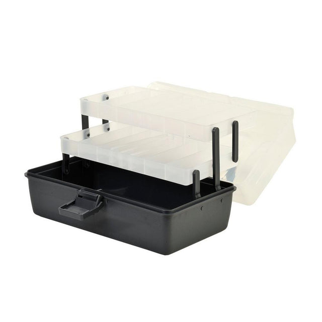 These cantilever tackle boxes come with a clear lid and either black or blue base. Both have part configurable compartments and carry handle available in a range of different size configurations.