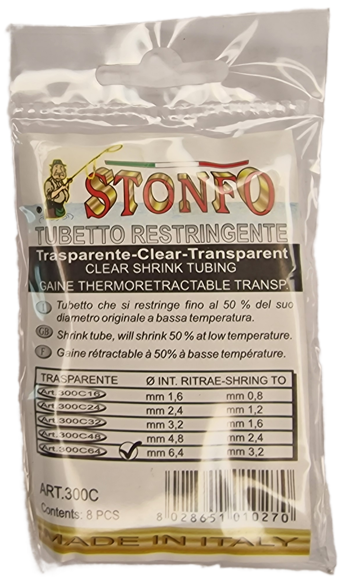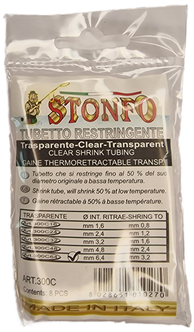 Transparent shrink tube, low temp shrink tube 50% shrink rate. Ideal to cover knots, create booms etc. Pack of 8 75mm lengths